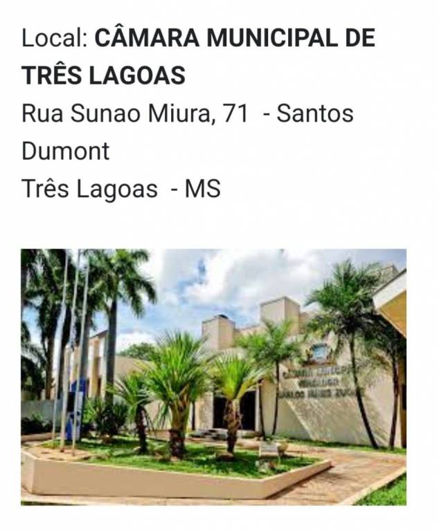 LOCAL: CÂMARA MUNICIPAL DE TRÊS LAGOAS - R. Sunao Miura, 71 - Bairro Santos Dumont - Três Lagoas MS